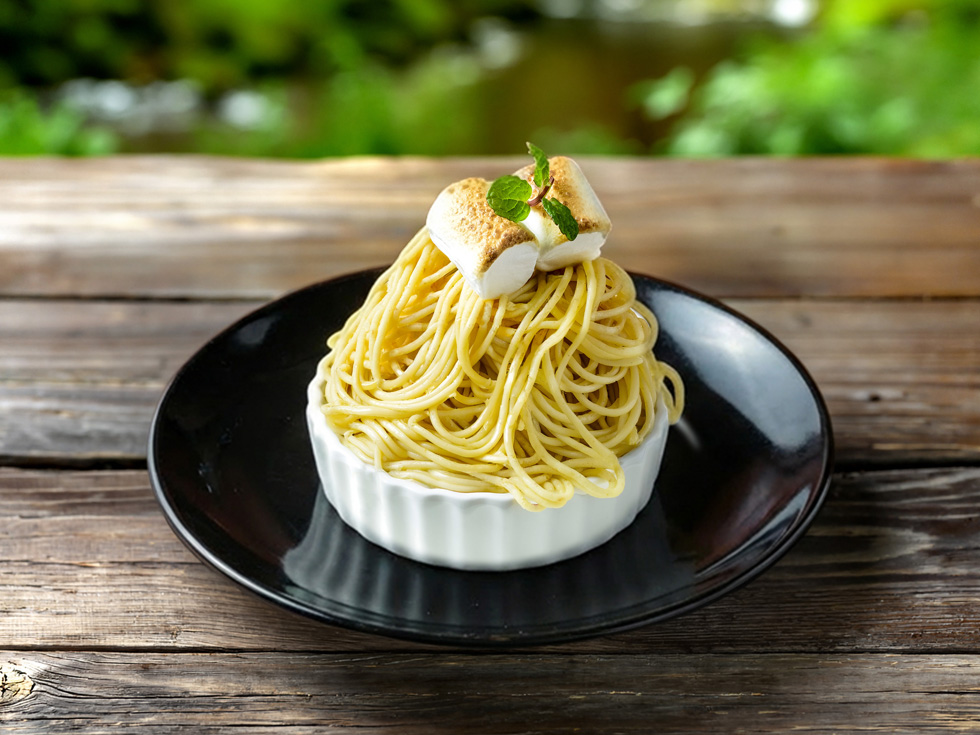 【新登場】恵那栗の絞りたてモンブラン。 栗本来の濃厚な風味を活かした逸品は、BBQ後の別腹スイーツとしてはもちろん、これを目当てに来店したくなるような、森の中の至福のデザートです。